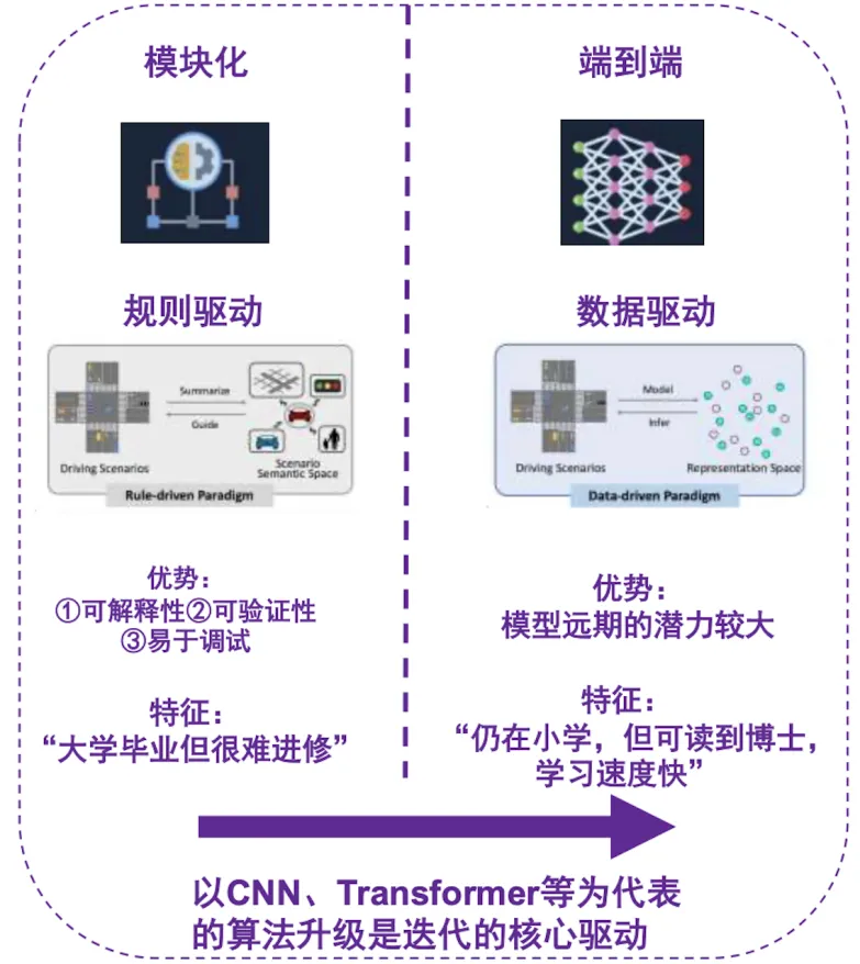 如圖7所示,基于一條一條代碼規則驅動的模塊化設計理念的車輛,讀到大學就無法再往上進修了,而基于數據驅動(給車輛看的老司機開車的視頻就是所謂的數據)的端到端雖然初期是在小學,但它具備很強的成長性和學習性(強化學習和模仿學習),可以很快地進修到博士。(就像余承東評價“Fsd下限低,上限高那樣”,但只要你有足夠多的數據,給予它足夠多的老司機駕駛的視頻,它不便不會停留在低水平太長時間)。
