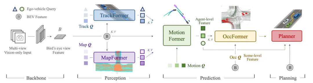 獲得2023年CVPR最佳論文的UniAD模型就是采用的顯式端到端,如下圖所示,我們能夠明顯觀察到各個感知、預測規劃等模塊采用了向量的方式進行連接。