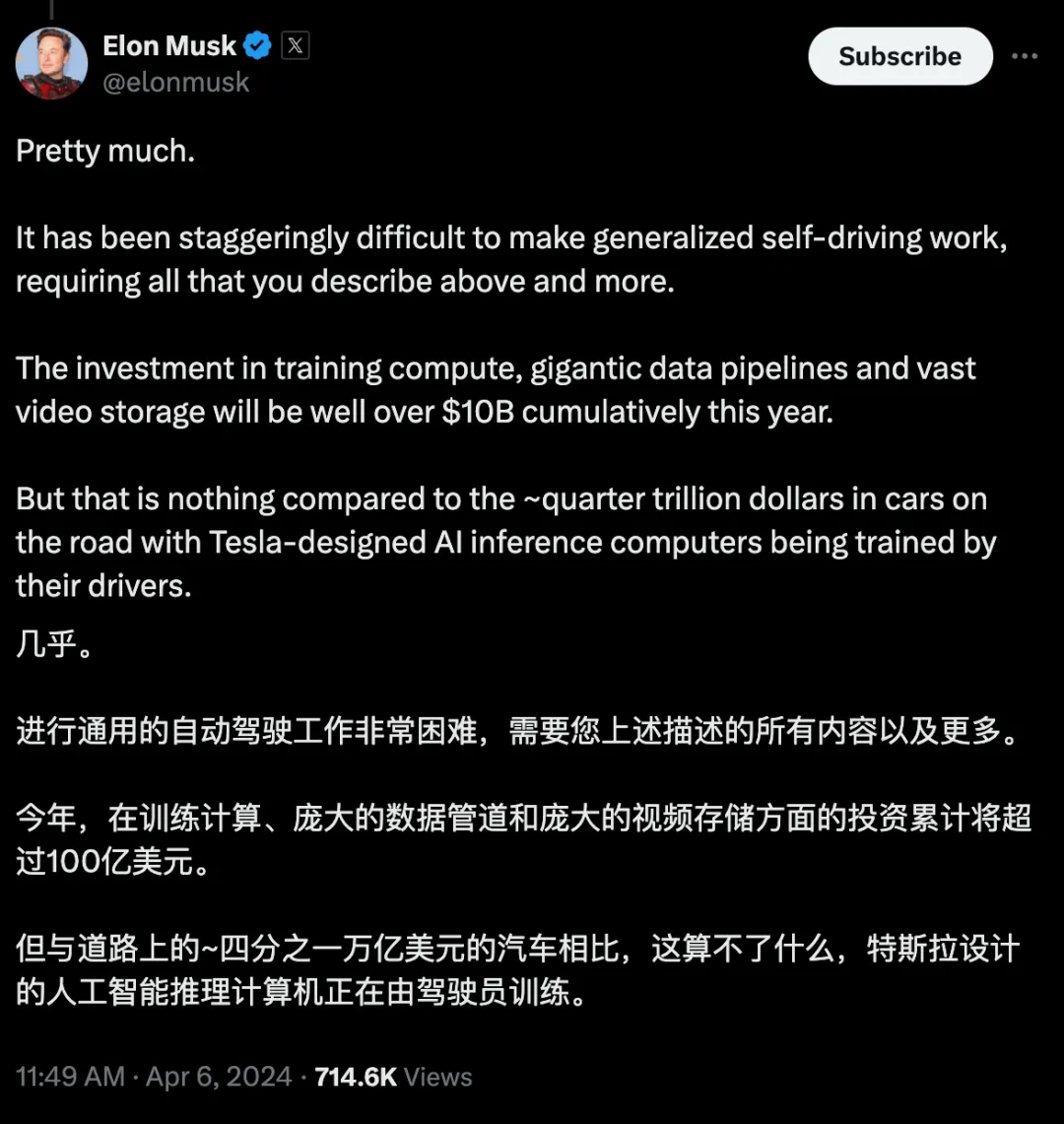 當然算力的背后還意味著巨大的資金投入,馬斯克在X(原推特)上表示今年將在自動駕駛領域投資超100億美元,也許真像理想汽車智能駕駛副總裁郎咸朋說的那樣,“未來一年10億美元只是入場券”。