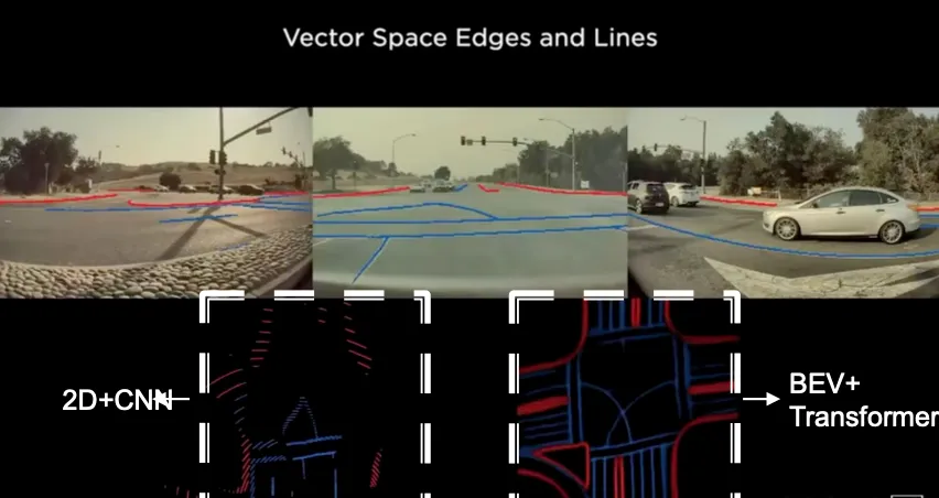 HydraNet幫自動駕駛的車輛完成了識別的工作,而對于車輛周圍環境的感知則由BEV(Birds’Eye View鳥瞰視角)+ Transformer完成,兩者的結合幫助特斯拉完成了將八個攝像頭捕捉到的2維平面圖片轉換為3D向量空間的工作(也可以由激光雷達完成,但激光雷達的成本要遠遠高于攝像頭)。