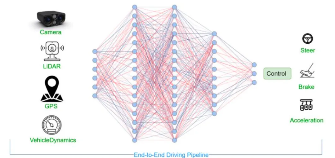隱式的端到端算法構建整體化的基礎模型,利用海量的傳感器接收的外部環境數據,忽略中間過程,直接監督最終控制信號進行訓練?!凹夹g原教旨主義者”認為如圖9這樣的傳感器信息一頭進入另一頭直接輸出控制信號的端到端才是真正的端到端,中間沒有任何額外模塊。