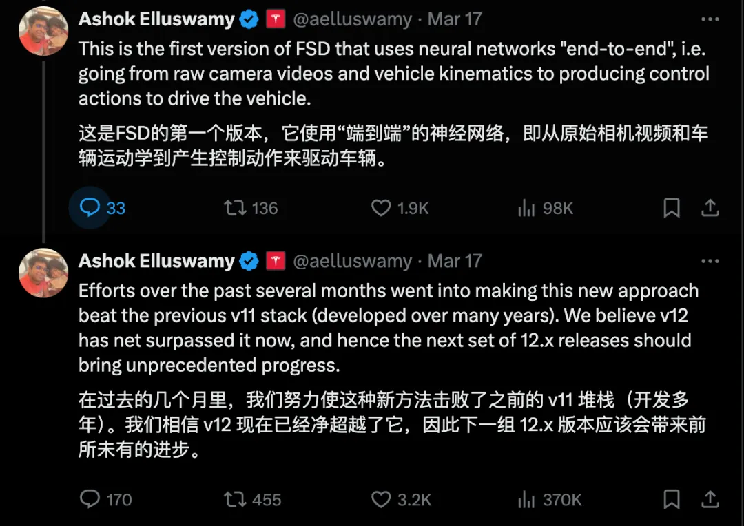 一年后,特斯拉在2024年初開始在一定范圍內推送FSD V12,并于同年3月將FSD Beta改名為FSD Supervised,特斯拉智駕團隊負責人AShok Elluswamy在X(推特)上發文稱基于“端到端”(“end-to-end”)的FSD V12在數月的訓練時間內,已經完全超過了數年積累的V11。