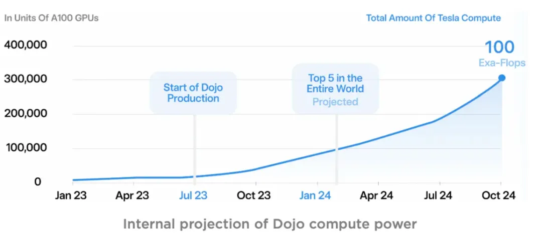 Dojo芯片投入量產后,Tesla由原先A100集群不到5EFLOPS的算力規模迅速提升到全球算力前5水平,并有望于今年10月達到100EFLOPS的算力規模,約30萬張A100的水平。